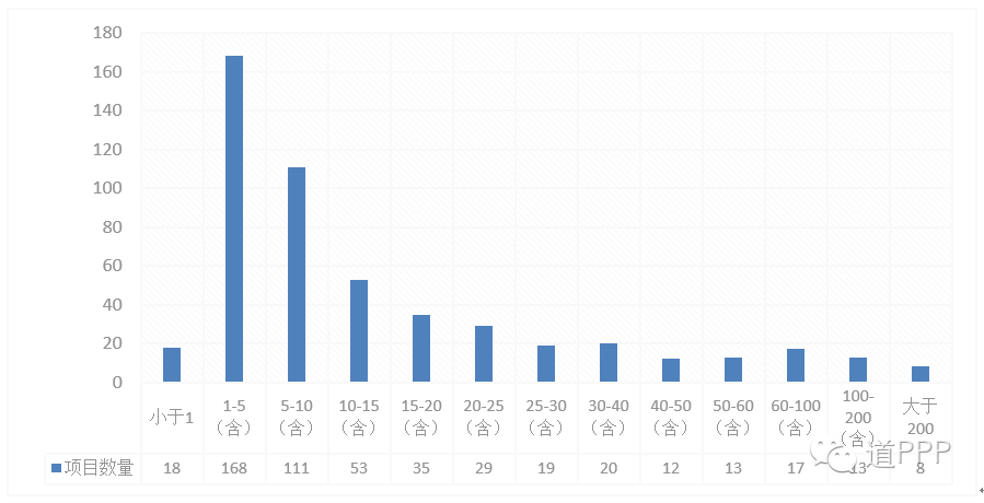 图1显示了本次示范项目投资规模分布情况,具体而言,1-5亿元区间的项目数量最多,为168个,5-10亿元区间的项目为111个,二者占比达54%;投资规模在1亿元以下的项目有18个,具体包括市政工程类12个、医疗卫生类2个、科技类2个、生态建设与环境保护类1个、养老类1个;100亿元以上的项目有21个,具体包括交通运输类15个、市政工程类4个(全部为轨道交通)、城镇综合开发类1个、生态建设与环境保护类1个。从项目规模上看,本次示范项目体现出两个特点:一是以中小型项目为主,这类项目进入的门槛较低,更能吸引民营资本参与;二是大型项目主要集中在交通领域,这类项目投资额巨大,也一直是较为成熟的PPP模式适用领域。