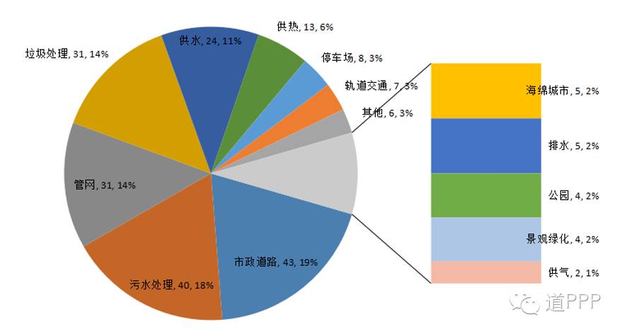 如图6所示,对应二级行业项目数量前5位分别是市政道路项目43个,占比19%;污水处理项目40个,占比18%;管网项目31个,占比14%;垃圾处理项目31个,占比14%;供水项目24个,占比11%。前5位项目总数占比76%。