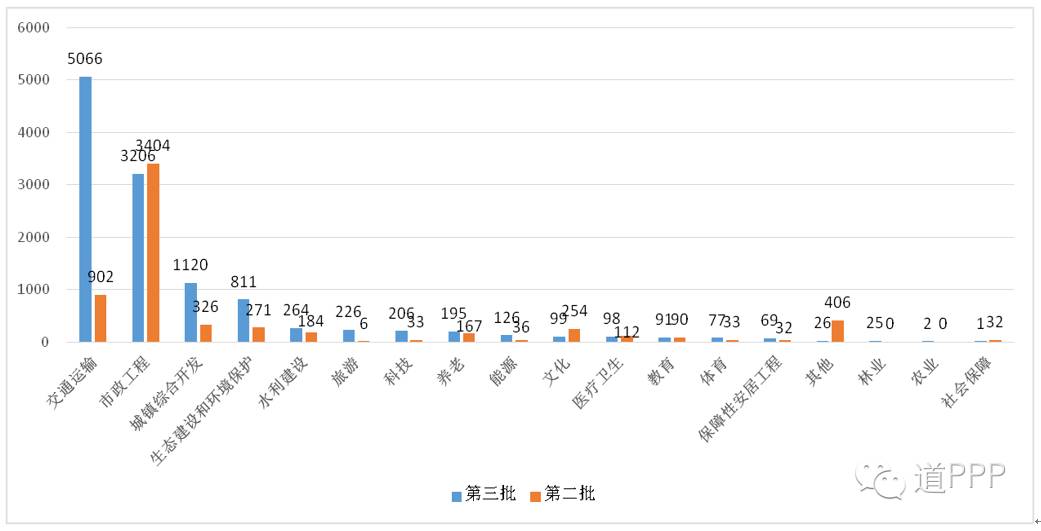 如图5所示,从投资金额上看,交通运输类项目总投资规模超过5000亿元,其次为市政工程类项目,总投资额超过3000亿元,两者占比超过70%。与第二批相比,第三批示范项目中交通运输、城镇综合开发、生态建设和环境保护类项目的投资金额大幅提升。新增投资额分别为4164、794、540亿元;市政工程、文化、医疗卫生、社会保障和其他类项目投资金额有所减少。