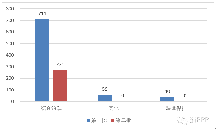 与第二批示范项目相比,新增项目33个,其中综合治理类项目增幅较大,湿地保护和其他两类为第三批新增二级行业类型;新增投资额539.4亿元。