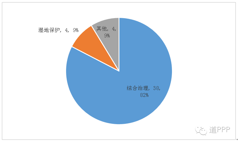 如图12所示,对应二级行业项目只有3类,分别是综合治理项目38个,占比82.6%;湿地保护项目4个,占比8.7%;其他项目4个,占比8.7%。投资总额分别为综合治理项目711.32亿,占比87.8%;其他项目59.14亿,占比7.3%、湿地保护项目40.1亿,占比4.9%。