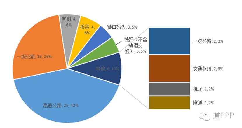 如图9所示,对应二级行业项目数量前5位分别是高速公路项目26个,占比42%;一级公路项目16个,占比26%;桥梁和其他类项目各4个,各占比6%;铁路项目(不含轨道交通)和港口码头项目各3个,各占比5%。前5位项目总数占比90%。
