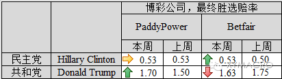 本周,Donald Trump竞选获胜的赔率出现分化,一升一降,目前赔率对应的竞选获胜概率仍较低。Hillary Clinton对应的赔率则一平一升。不过,二者的赔率差异仍然较大,暗示赔率对应的Hillary Clinton的获胜概率仍然领先。
