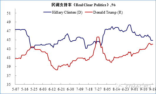 本周,Hillary Clinton的民调支持率为44.9%,相比上周的45.8%有所下降;而本周DonaldTrump的民调支持率为44.0%,相比上周的43.4%有所上升。近日关于Hillary身体状况的质疑声日益增加,这使得Trump支持率有所提升。