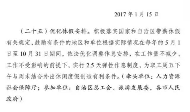 实施方案中指出:积极落实国家和自治区带薪休假有关规定,鼓励有条件的地区和单位根据实际情况在每年的 5 月1日至10月31日期间,依法优化调整作息安排,在工作量不减少、工作不受影响的前提下,实行 2.5 天弹性作息制度,为职工周五下午与周末结合外出休闲度假创造有条件。