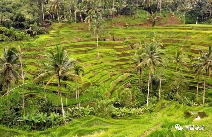 田间点缀的椰树和雄伟的火山背景使它在世界上无数的梯田中独树一帜,难得的是热带风光与田园景色的完美契合。