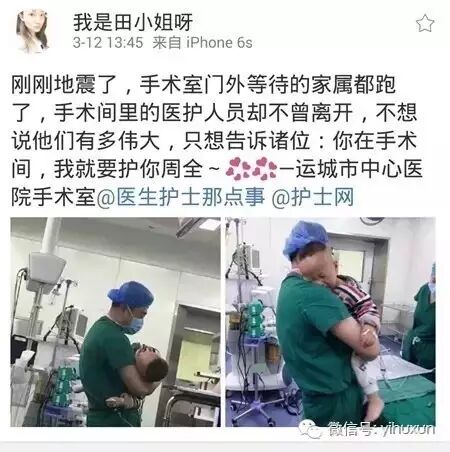 看看中心医院的医务人员是怎么说的:地震了,手术室门外的家属都跑了,手术间里的医护人员却不曾离开,不想说他们有多伟大,只想告诉诸位:你在手术间,我就要护你周全。
