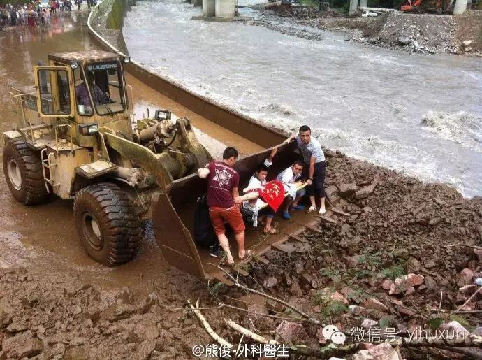 前几日,从7月26日18:00至7月27日8:00,四川雅安市普降大到暴雨,局部大暴雨。导致雅安发生了泥石流,急救人员翻山越岭,冒着随时可能再次发生意外情况的风险,肩扛手抬担架运送患者,用推土机转运骨折病人,因泥路崎岖,120急诊护士摔至满身泥水也不在乎。