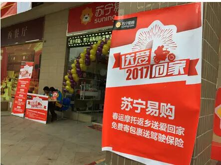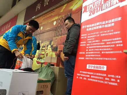 1月13日,2017年春运第一天,苏宁易购发起的“送爱回家”公益行动同步启动。记者走访看到,在苏宁门店,陆续有摩托返乡人员将行李送来邮寄,获赠驾驶人意外险。回家不再有“包袱”,有份保险心里踏实,老乡们感受到冬日里的苏宁温度。