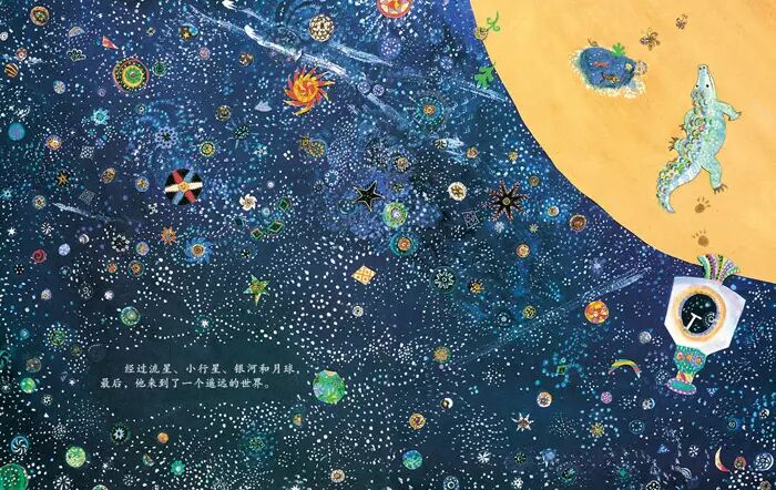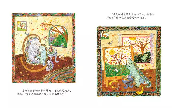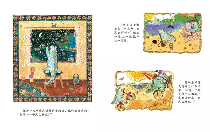 无论孩子或是艺术家都无法拒绝这样的故事开头:“从前,在一个到处是阳光、大树、昆虫、贝壳、鸟儿和美丽夜色的地方……住着一只叫作恩斯特的小鳄鱼,他特别喜欢问‘要是……会怎么样呢?’”作者用点绘和晕染的手法绘制了这些饱满而精巧的画面,映现出小鳄鱼心中那个明净光亮的世界。——美国《学校图书馆杂志》