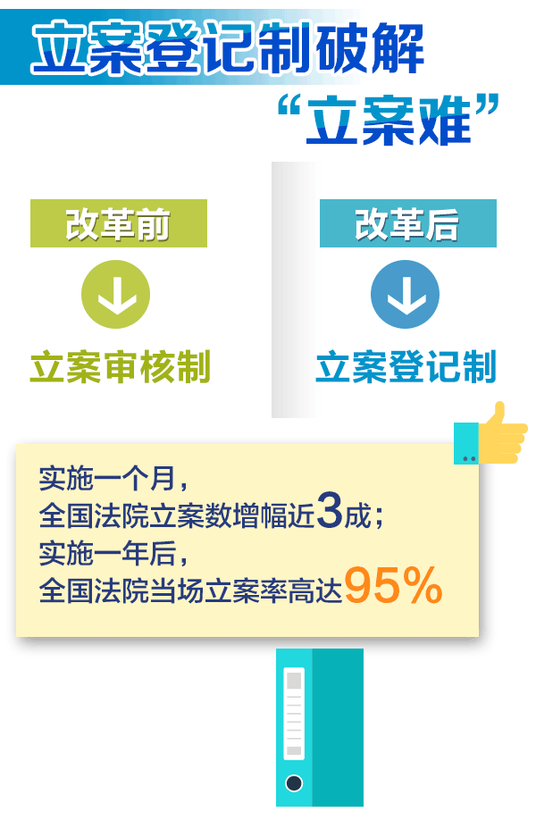 【进展成效】去年5月1日,,效果立竿见影。仅一个月,,其中,行政案件数量同比增长221%;一年后,,当场立案率高达95%;2016年上半年,.9万件,首次突破千万件。有案不立、拖延立案、年底不收案等现象基本消失。
