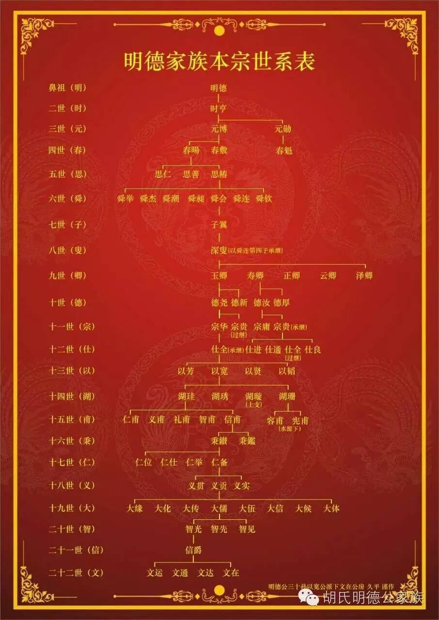 始迁祖明德公,字复初,行盛十三翁,江西南昌人,生于大宋开宝七年(974年)岁次甲戍,正月十五日辰时,淳化年间进士及第,官至礼部尚书,封为大宗伯,诏出祭九嶷,(舜帝陵)香进重华,东临桂郡,路径燕溪,见这地方,风景秀丽,,峰峦叠翠,地脉幽灵,(乃嘉禾八景之一)于是解官后金朋玉友共一十三人迁来此处,下开祁子云孙,现在湖南嘉禾、临武、蓝山、新田、宁远、桂阳、道县、宜章、郴州、永兴、资兴、永州市菱角塘、耒阳严冲村、常德、益阳、广东连州、阳山、韶关、广西梧州、,富川县、恭城县、四川等地胡氏皆其后裔。配李氏,封夫人,太平二年(公元977年)丁丑岁三月初一日巳时生,后卒葬本都黄泥塘栗山下,童子讲书形。公妣同墓。
