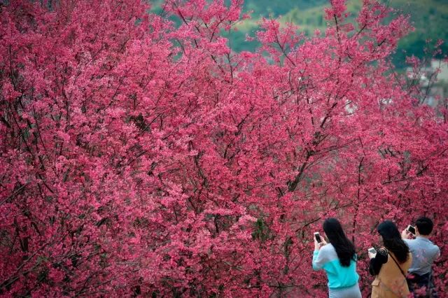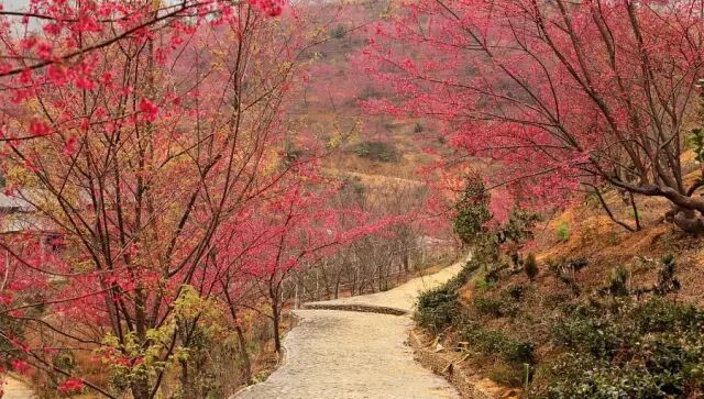 在落满花瓣的广东韶关樱花小径漫步,消磨时光。