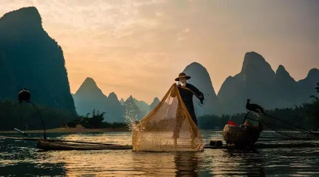 在山水秀丽的广西阳朔,乘竹筏游漓江。