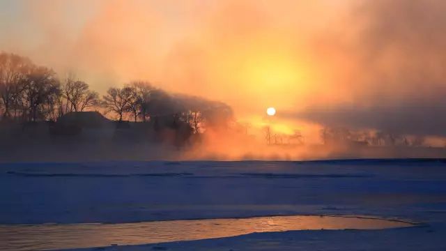 在夜幕降临时,气温下降到零下30摄氏度左右时,江面上弥漫着的阵阵雾气便随风飘荡,涌向两岸,笼罩着十里长堤。