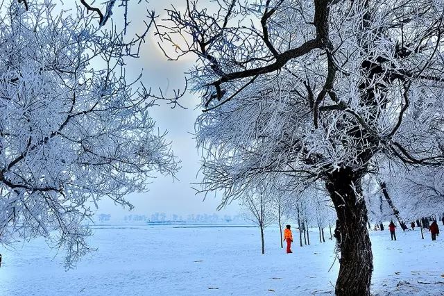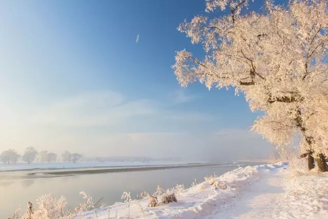 松花江畔的十里长堤上,洁白晶莹的霜花缀满了枝头,在阳光照耀下,银光闪烁,美丽动人。