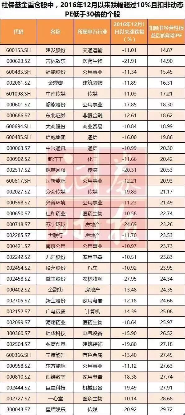 下面是社保基金重仓股中,2016年12月以来跌幅超过10%,且估值相对较低的部分个股,从安全性和超跌的角度,这些个股也有望成为养老金投资的目标,供读者参考。