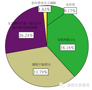 第三,“改革开放问题”共识——聚焦于两极分化与干部两大问题。第一次调查(数据库一)表明,受访者对改革开放的主要忧虑,依次排列是:“导致两极分化”(38.16%);“不能根治”(33.79%);“生态破坏”(26.24%)。
