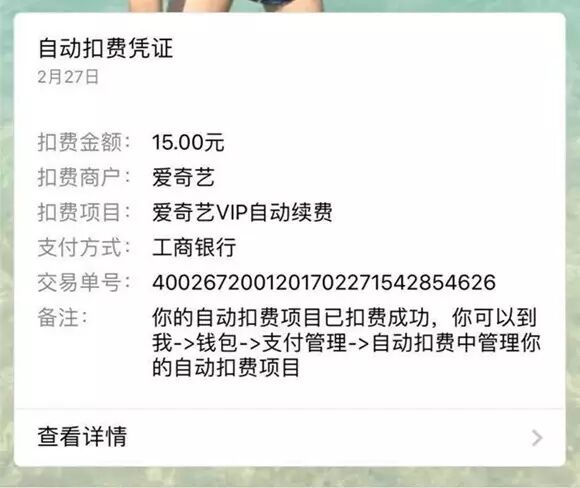对方告诉他,今年1月29日,一个手机号码开头为157的用户,开通了爱奇艺的VIP连续包月服务,每个月扣除15元,到了2月28日就自动续费了,赖先生收到的其实是续费凭证。