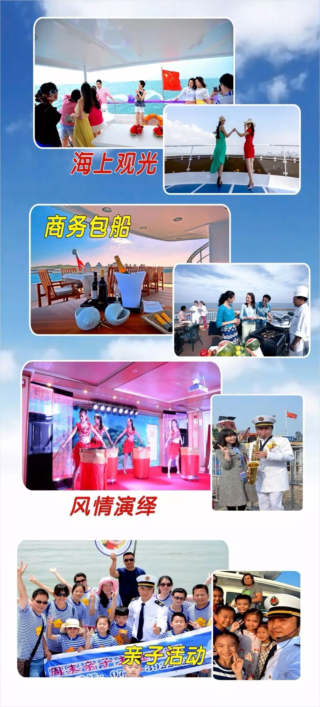 海上观光、商务自助餐、休闲小吃、KTV音乐厅等服务。可根据需要提供:商务会议包船、公务接待包船、生日聚会包船、婚纱摄影包船、海上休闲垂钓包船。