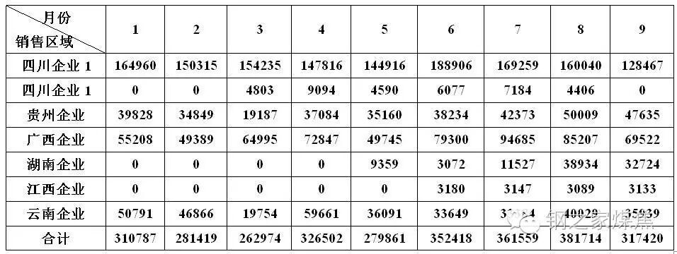 正常情况下云南的供应缺口尤其是低灰份优质焦煤绝大部分主要由相邻的贵州资源补充,2014年以来每年均超过200万吨以上,但2016年1-8月,贵州规模以上原煤产量10832万吨,同比下降4.6%,同时其粗钢产量同比增加10.1%,水泥产量同比增加7.1%,说明其自身主要用煤行业需求增长的同时产量也在下降,由于其产量大于自身需求量,导致其供应周边省份的供应量下降,尤其是进口煤价格高企必将导致其将资源向价格向进口煤看齐的华南、湖南等地区倾斜。以西南某煤矿精煤为例,其2016年1—9月销售流向表如下: