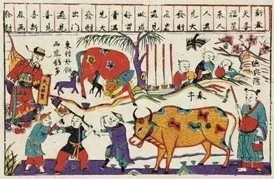 把二开红纸或黄纸印上全年农历节气,印上农夫耕田图样,名曰“春牛图”。