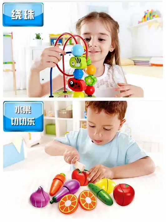 除了积木,木制的绕珠玩具、水果切切乐、拼插类玩具等也很有意思