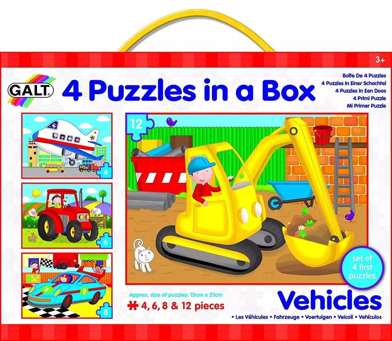 这种套装是每套4款拼图,从易到难。车辆套装是从4片飞机拼图到6片拖拉机拼图到8片汽车拼图到12片挖掘机拼图。