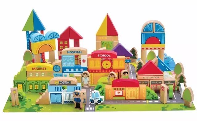 Hape城市情景积木,含有125个积木块+20块拼图。拼图上印有道路、湖泊和绿化景观,完成后可作为城市的背景图。积木块可以拼出一座小城市:警察局、医院、消防局、学校、超市、车站、小卖部等等生活设施一应俱全;消防车、警车、急救车、轮船、小汽车、路灯、红绿灯等等各种交通设施也都包含在内。除此之外还含有26个英文字母、9个数字、3个运算符号等益智积木块。