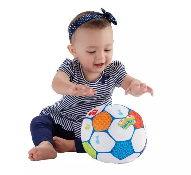 这款音乐足球是费雪和歌手夏拉奇的合作设计款,球是软质材料,布面上有老虎图案、音符、色块等设计元素,柔软布球的大小和质地适合宝宝用手抓、打、抛或用脚踢,通过拍打撞击,小球会发出可爱的声音和有趣的音乐,声音包含2种音乐模式和11种音调。