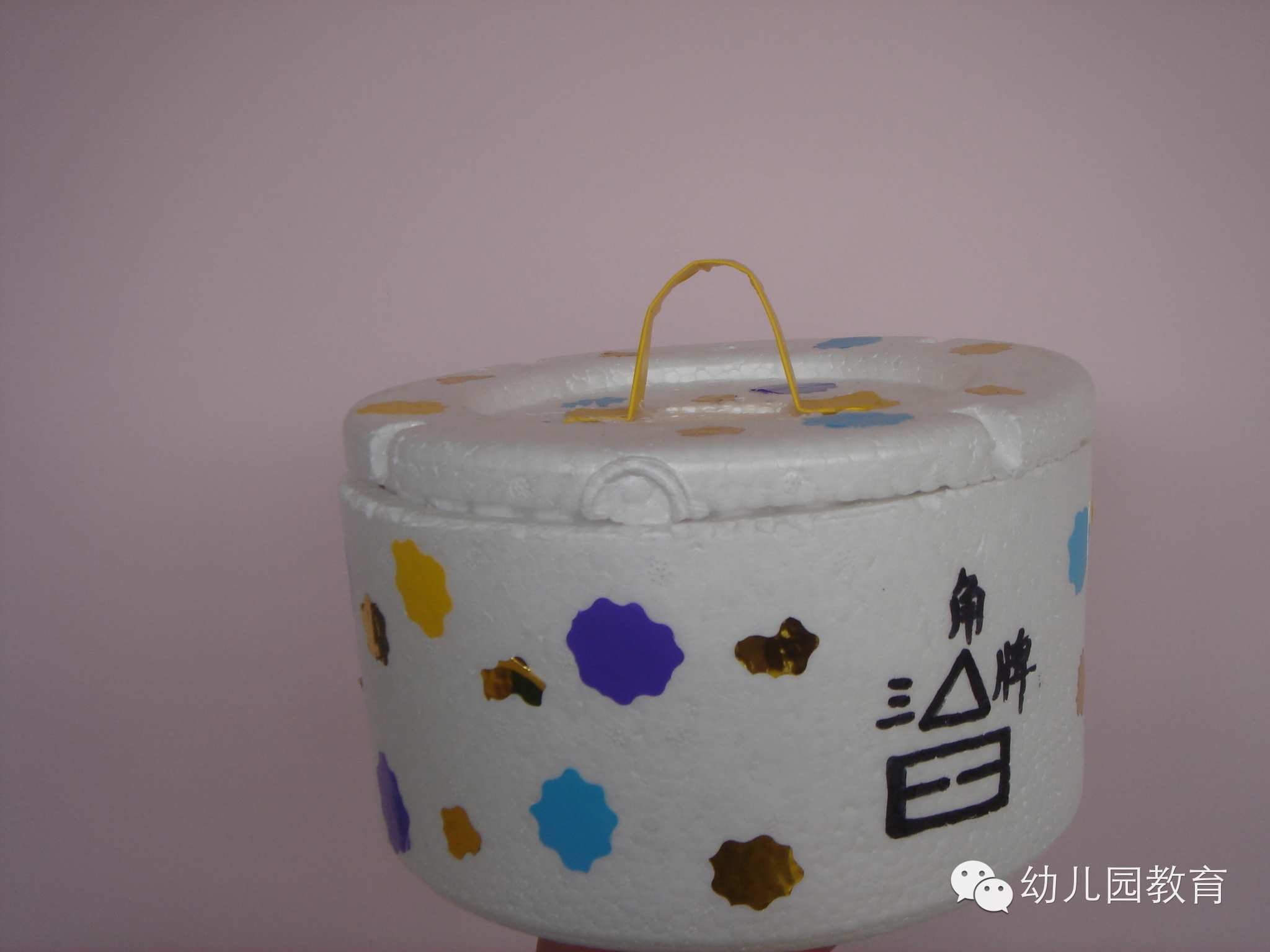 2.五彩鼓、七音鼓。用丙烯颜料将废旧的铁质、纸质饼干盒、月饼盒进行装饰后用细铁丝固定在竹筛上,再取两段小竹子做鼓槌。