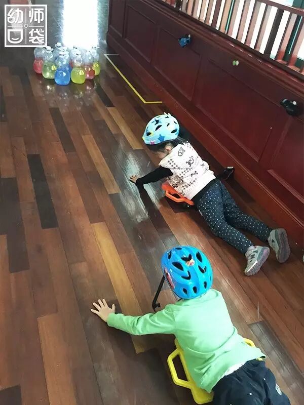 趴在方形四轮滑板车上,“身体保龄球”准备就绪