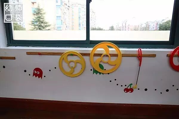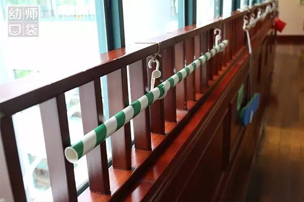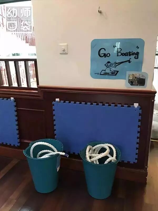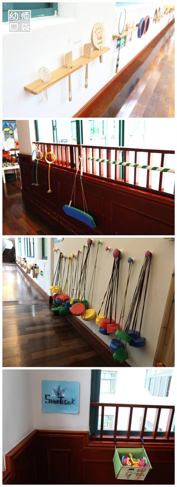 这里每条走廊都被充分地利用了起来,用适宜的方式收纳着对应各种小运动的材料与用具,不仅极大限度地利用了空间,而且也更加方便让孩子们可以随时取用材料进行“玩耍”。
