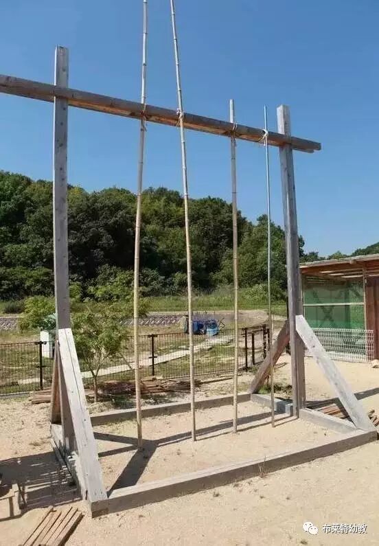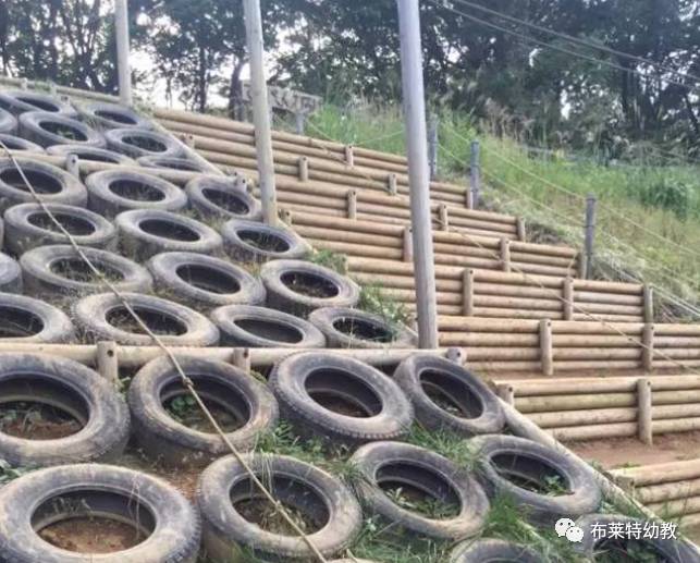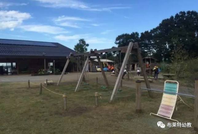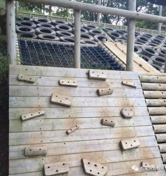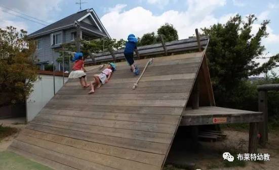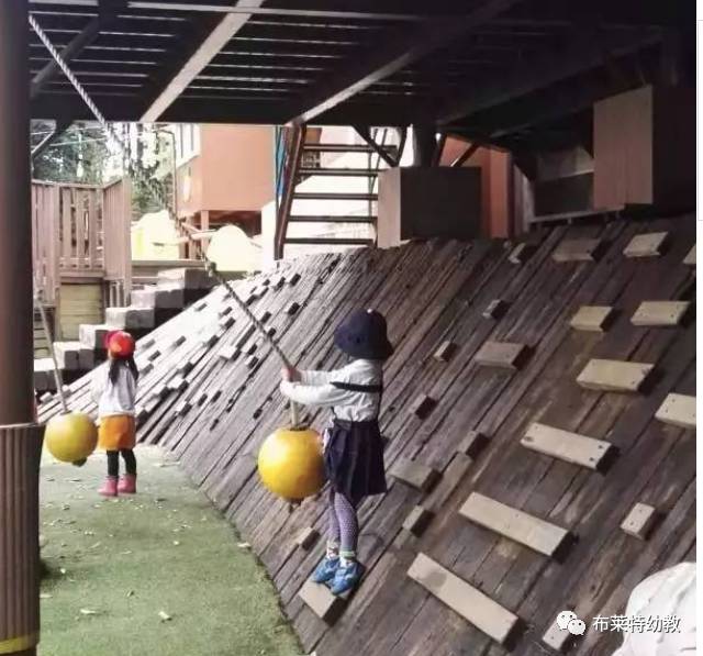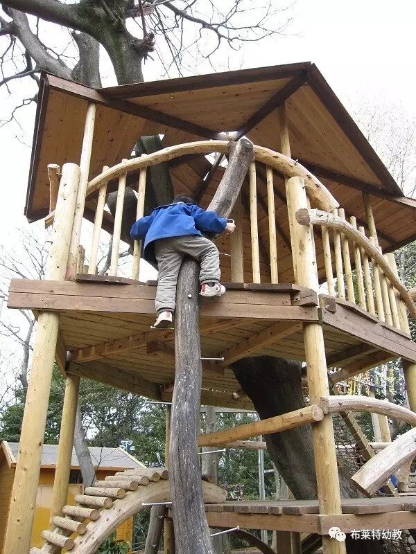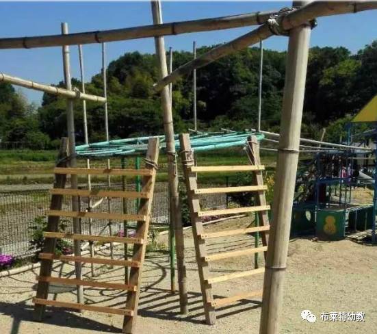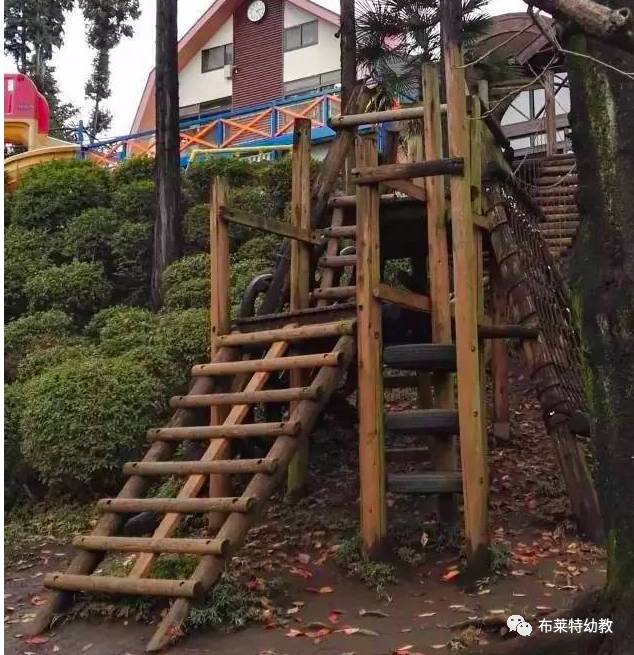 日本幼儿园户外通常都有一种复合运动器械,用原木制作,包括攀爬架、悬桥、滑梯、平衡木、爬网等。