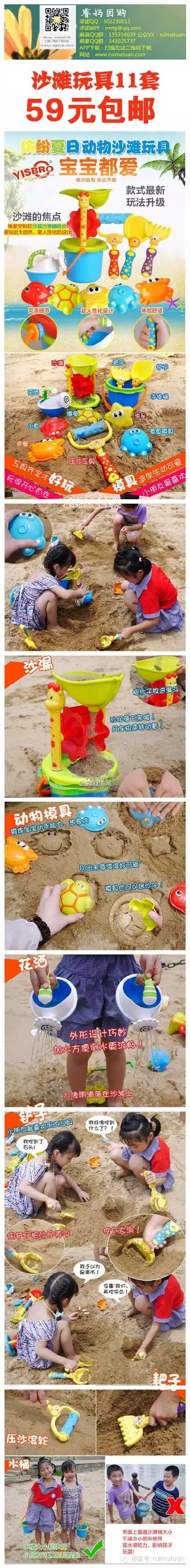 6月18日10点:益之宝儿童沙滩玩具11件套装,夏日动物沙滩玩具,宝宝们都爱的哈~材质是ABS环保塑料,光滑无异味,结实耐玩,质量做工都非常好的,能锻炼孩子的想象力和创造力。每个都是独立包装,非常超值。套餐包含沙漏、水桶、浇水壶、动物模具、挖沙工具等,团59包邮除偏,前10晒返5