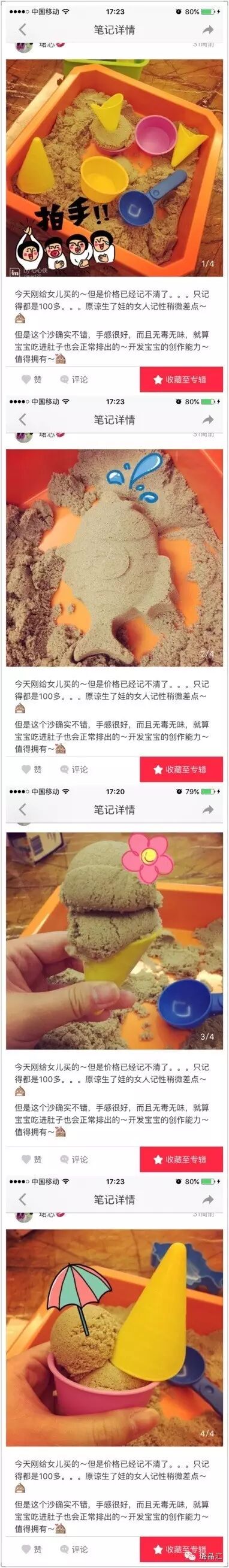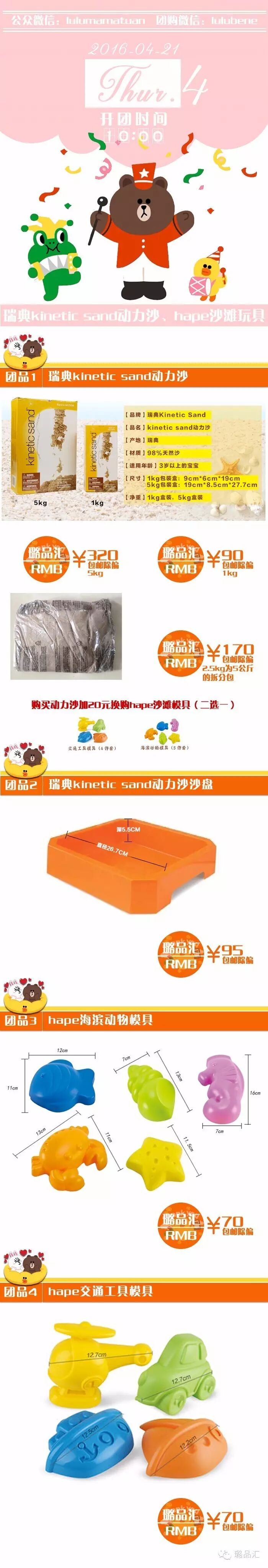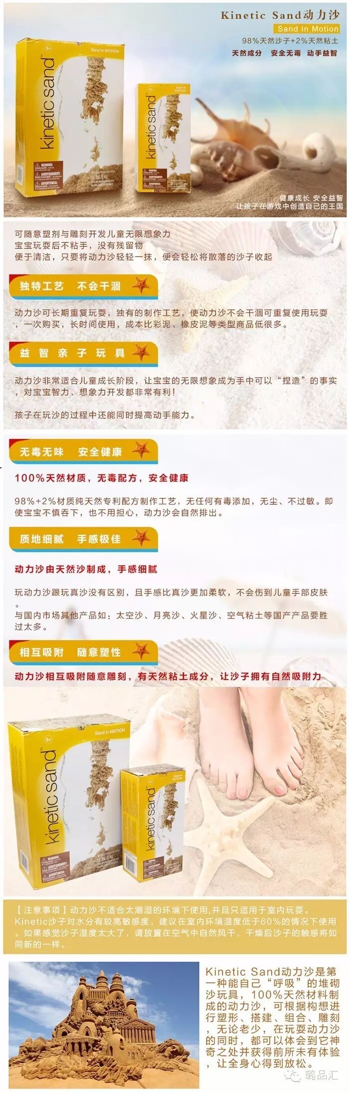 瑞典制造,安全无毒的kinetic sand动力沙,100%天然材料制成,无毒,易塑形,不干固,不粘手!是动力沙里的NO.1了!我之前在展会看过捏过N种这类沙,kinetic sand的最最好!就是价格相对高些!but孩子的东西安全最重要~当然有动力沙怎么可以没有造型工具?这次特地配合动力沙准备了二款hape的沙滩模具,如果跟动力沙一起买的话,超福利!只要加20元就可换购到了~hape的沙滩玩具也是超出名的,质感非其他小牌能比的~同时玩动力沙的沙盘也有团,一起把它们抱回家吧,夏天室内吹着空调一样可以玩沙子~它不仅仅是一个玩具,还是一个开发脑力和促进小孩的动手能力的好伙伴!