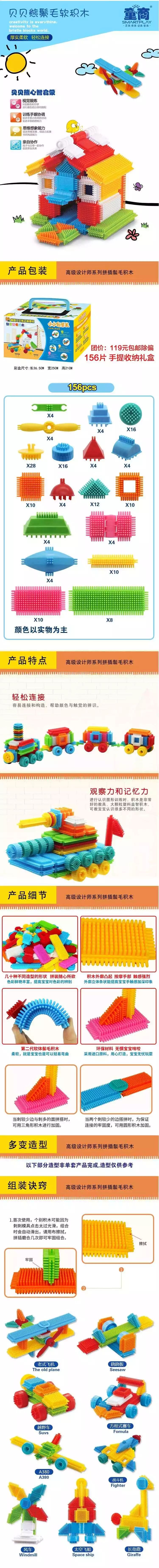 儿童益智刺刺软积木,鬃毛拼插玩具,采用进口材料,环保安全,能帮助宝宝识别颜色和形状,进行颜色分类和搭配,训练宝宝手眼协调,促进手部小肌肉的活动和手的控制力,促进宝宝思维发展,开发想象力和创造力,亲子协作还能增进亲子关系,刺刺软积木能轻松连接和构造,几十种不同造型的形状,拼装随心所欲!~