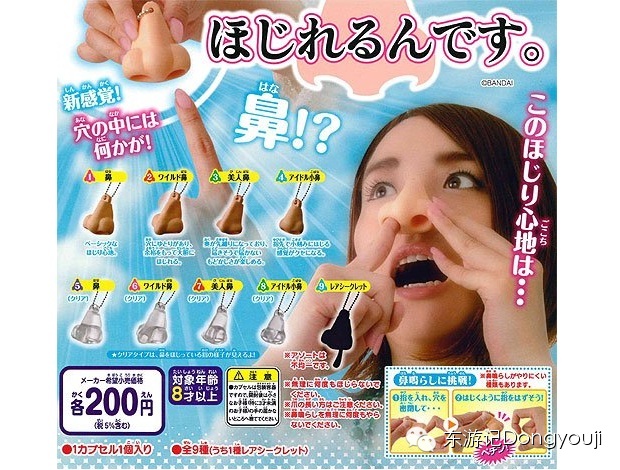 下面这个不容忽视的商品同样来自于Bandai。这是一个可以让你公然抠鼻子的钥匙圈。这个商品没什么新意,不过也卖得不错。另一个玩具巨头多美公司,最近发布他们的扭蛋品牌叫做“熊猫洞”。至今为止,熊猫洞下已经发售了两个系列的扭蛋“炸鲨鱼”和“动物园”。