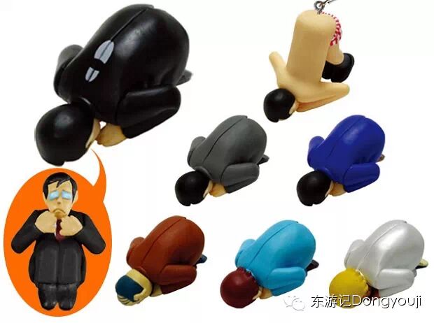 扭蛋通过一种带摇手的扭蛋机来进行发售。在很多商场,特别是电器商城的出口处,你都能看到一排排的扭蛋机。扭蛋跟其他的玩具商品一样,被决定做成扭蛋的动漫人物都是出自那些已经非常有人气的作品。而这些人气作品也利用扭蛋发售来进行二次宣传。 奇谭俱乐部开发制作的两个扭蛋系列,“活着”系列—谢罪手机链(土下座ストラップ)和杯子上的缘子小姐(コップのフチ子)由于其特殊的题材性在普通上班族中间引起了巨大反响。谢罪手机链其实就是各种摆出下跪(土下座)的姿势的人物模型,表现了日本普通上班族为了工作不顾一切,坚韧不拔的精神(希望大家可以多关注关注这些人物的表情w)。而杯子上的缘子小姐则是一个穿着一般OL服装(更精确地说缘子穿的是大企业的前台服务员,秘书的服饰)的女性模型,唯一不同的是这个模型可以被放在杯子的边缘作为装饰。奇谭俱乐部发售了很多不同版本的缘子小姐,这其实是他们开发的第一组商品。无可置疑,缘子小姐上也有着淡淡的萌要素存在,不是么?Bandai(バンダイ)的智能手机内裤(スマートパンツ)应该会是你最后想在自己手机上装的东西之一了。而且我猜,你应该不会抗拒多卖个几套来“换洗”的。