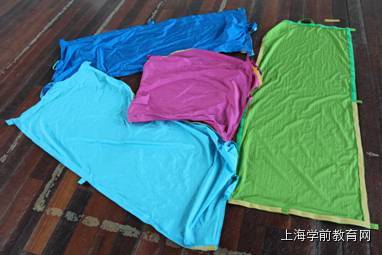 利用边缘缝制的雌雄搭扣变换形式开展各种运动,不同年龄阶段的幼儿可以积累不同的运动经验。如:把“魔布”拼接成跳跳床,结合球帮助幼儿积累抛接的运动经验;把“魔布”变成跳跳袋,帮助幼儿积累跳跃的运动经验;把“魔布”变成不同宽度的“小河”,帮助幼儿积累跨跳的运动经验。