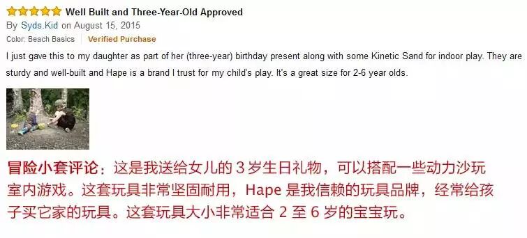便宜的沙滩玩具很多,那种酒店送的或海边临时买的,那个质量,那个塑料,那个软,那个味,就别提了,根本不敢给宝宝用。Hape的品质很棒,拿到手里就知道了,一套真的可以玩N年。