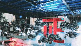 到了晚上,100辆哈雷都动起来啦!热闹而有序,激情而不放纵。配合着背景音乐与彩色光影,以及时有时无的雾气,烘托出装置艺术的终极幻影效果!!