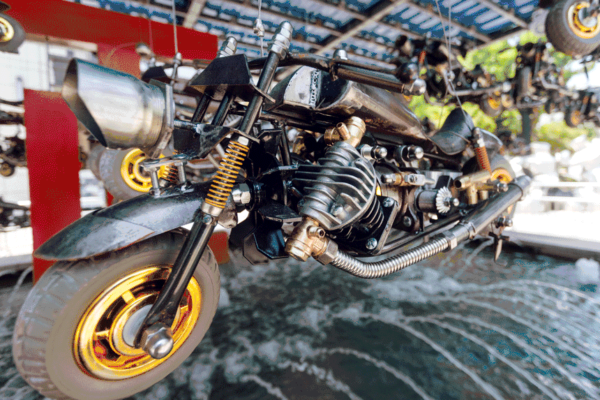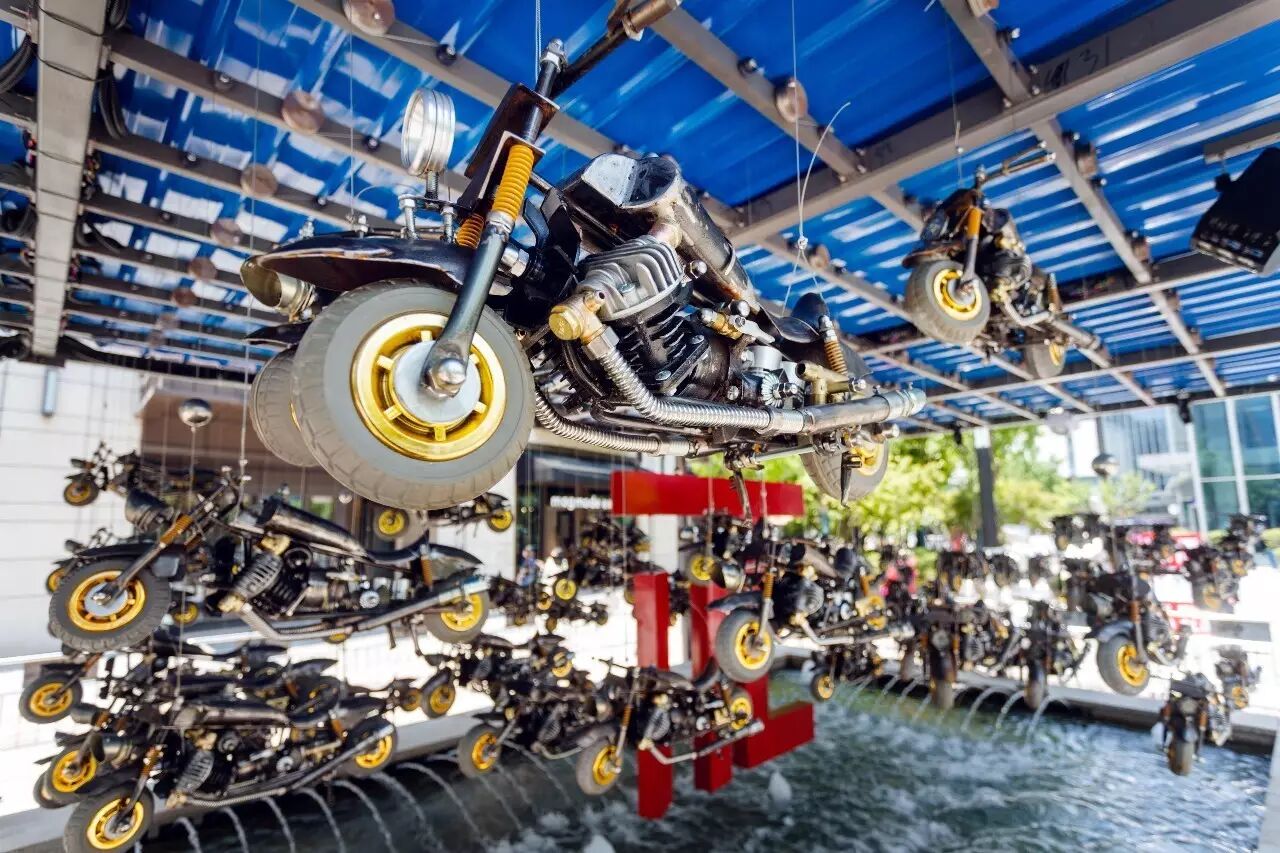 哇!好震撼的装置艺术!杭州艺术家周峰说:“连续六个通宵,为了这个作品的心都有了!” 全手工打造了100辆哈雷机车模型,历时一年多才创作完成! 不仅有立体感、空间感、视觉冲击,还体现经济和环保的双重价值哦!