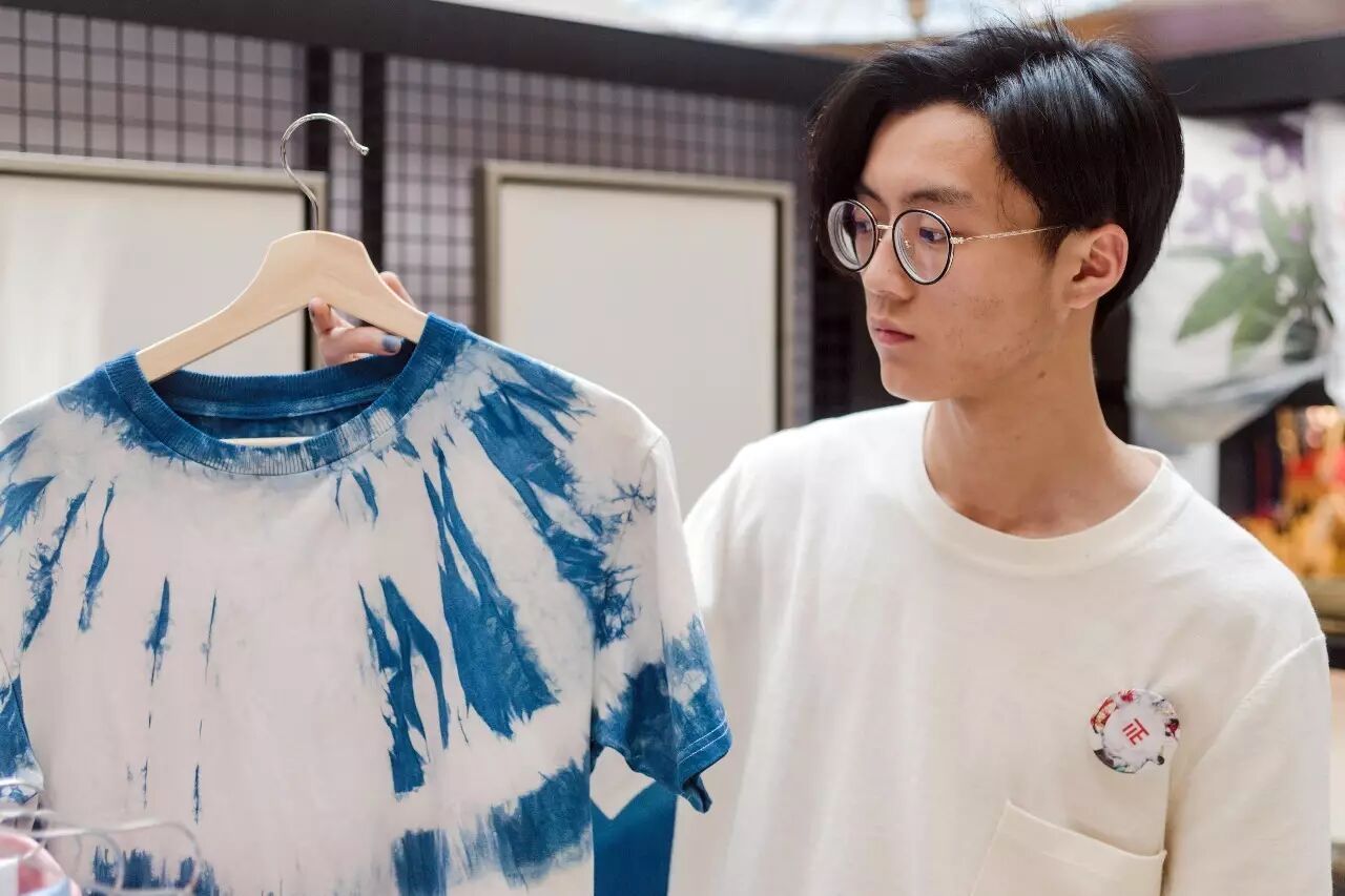 板蓝根染出的T恤,天然还很有时髦感!学徒小哥哥染布的时候也把自己的手指染成了蓝色,“天然美甲”耶~~