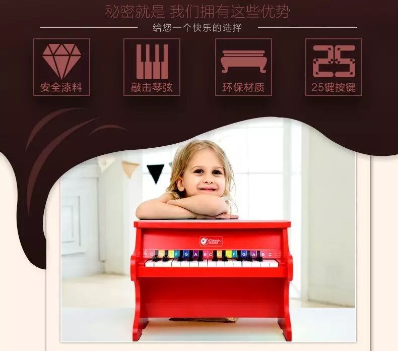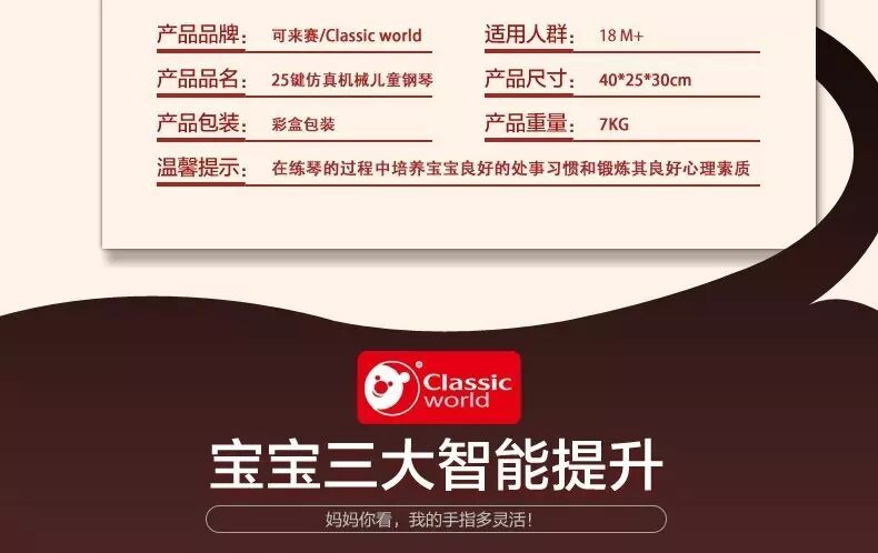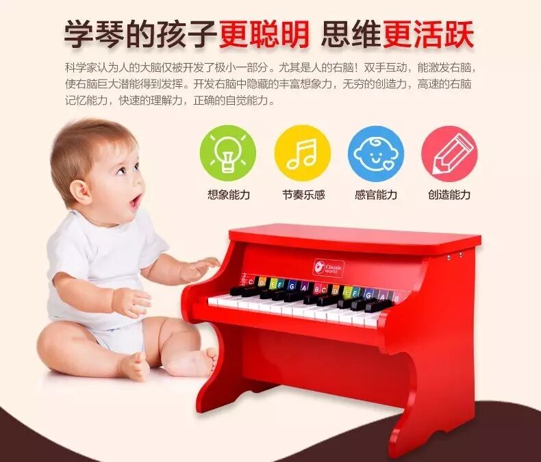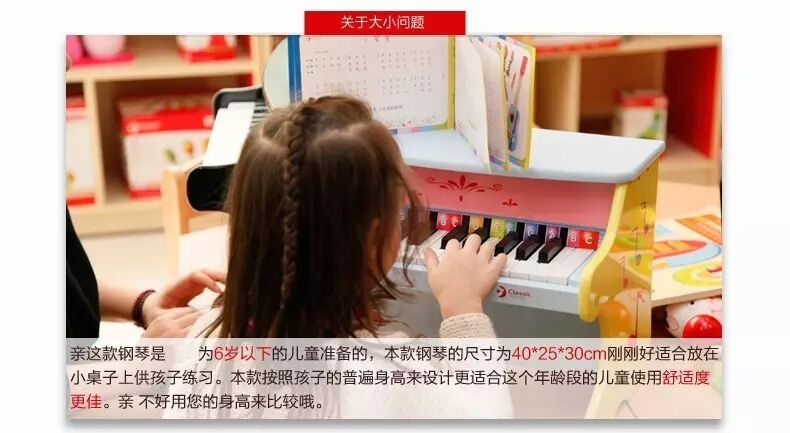 而且有时候妈妈们不知道孩子会不会对钢琴感兴趣,买回来一台钢琴如果孩子不喜欢弹真的很浪费,用这台玩具小钢琴让孩子练练手,喜欢的话再买钢琴开始学,不喜欢当玩具玩也不会浪费,价格也不高。