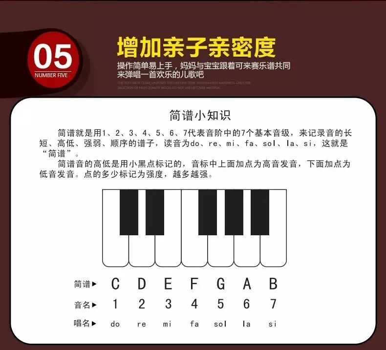 为了方便宝宝练习钢琴,琴键上还贴有指导性琴键贴标,帮助宝宝快速熟练学习琴曲。