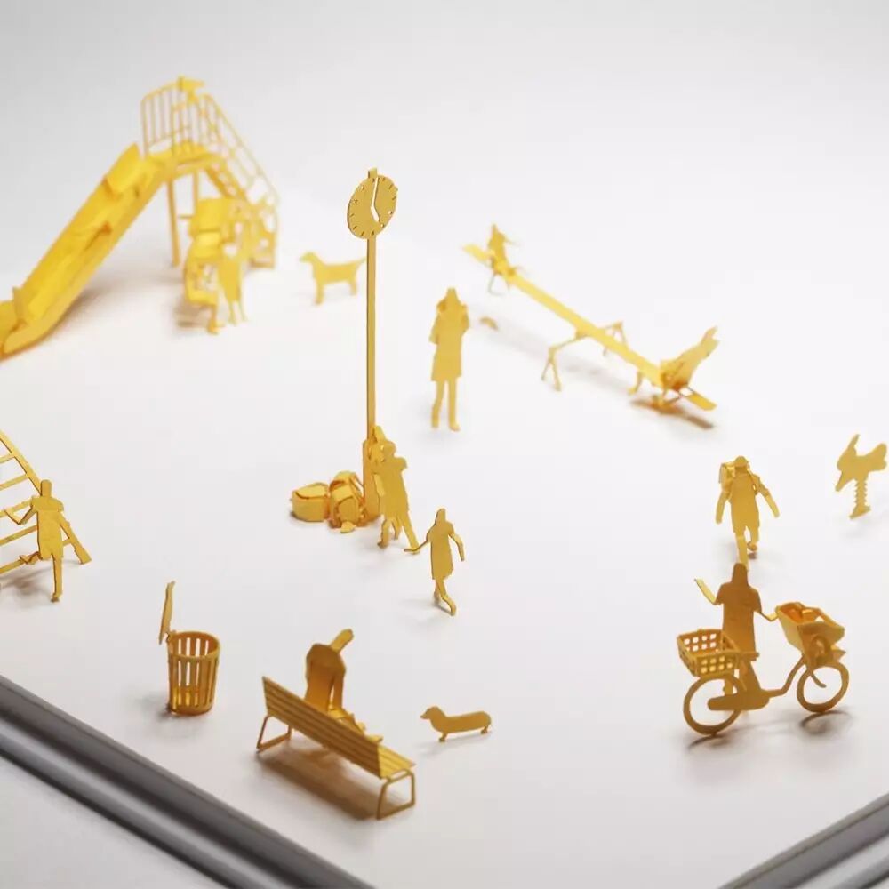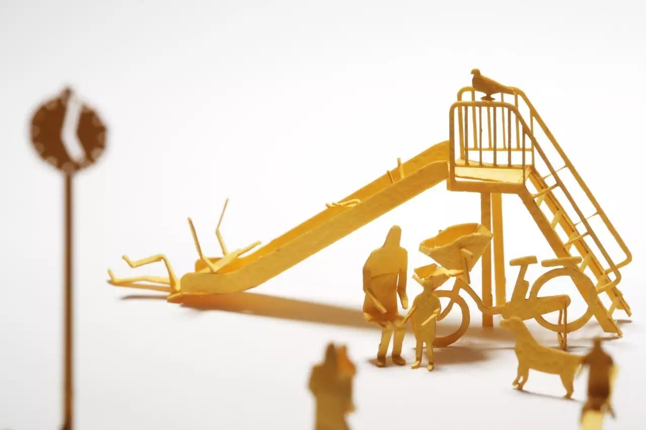 结束一天紧张而又快节奏的工作后,你准备好进入1Q84年那个天上飘着两个月亮的世界了吗?TERADA MOKEI将细致入微的生活场景,按照1:100的比例微缩成迷你的纸模型。通过人物和物体的轮廓剪影化,呈现出一个个熟悉又亲切,细小又精细,艺术又魔幻的纸艺生活秀。