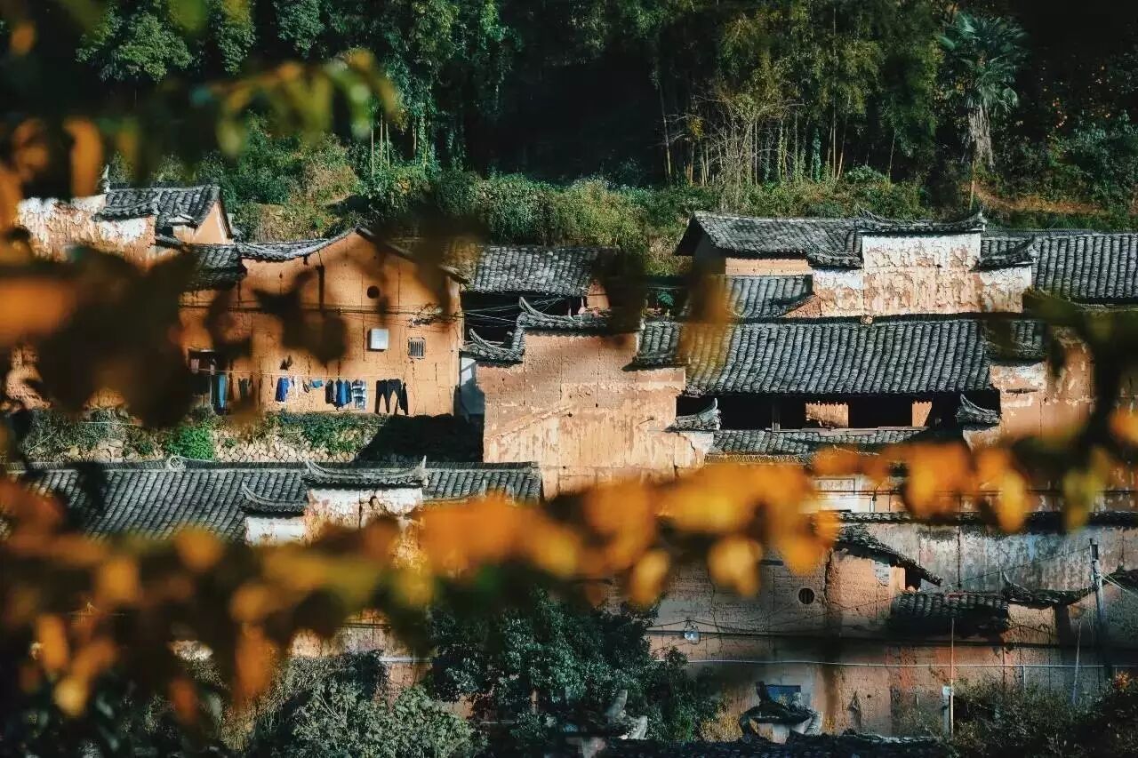 酉田村村落依山而建,错落于绿水青山间外,夯土墙、黑瓦片,午后,青山黄墙格外分明。