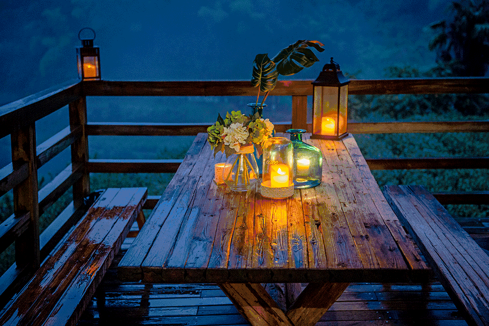 屋外的观景台从进村的亭子里便已看到,夜渐黑,茶园山谷的作伴下享用夕阳晚餐。