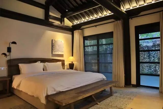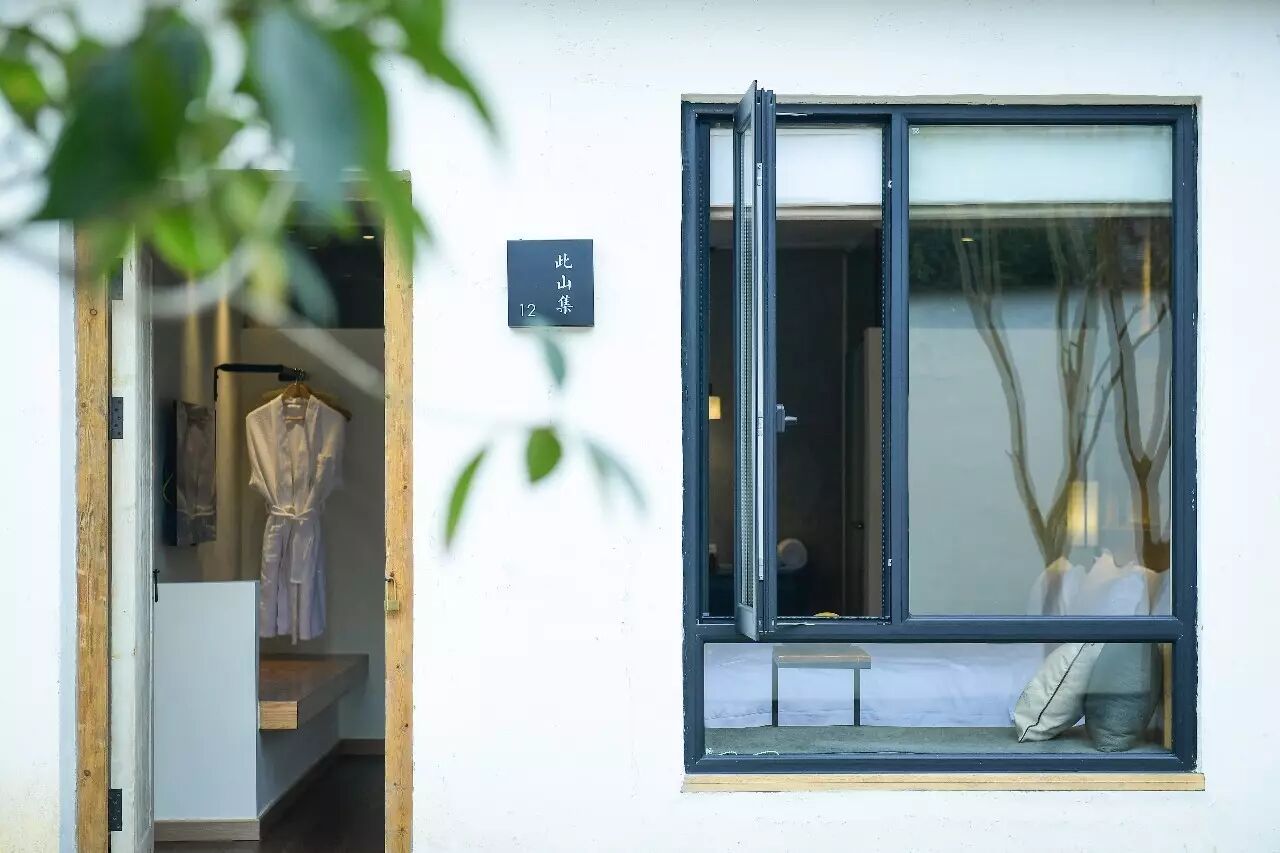 看过每个房间后便会发现,它们无一例外都有一面巨大的落地窗,且在房间合适的位置多开窗极尽采光之能,初衷自然是让古村的剪影和无限山谷风光投入房间。